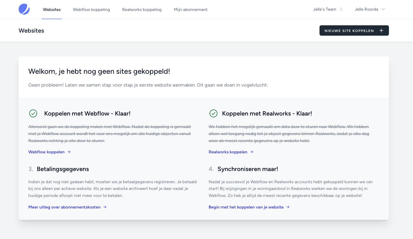 Koppel met een paar klikken één of meerdere webflow sites in onze applicatie. Fluitje van een cent.